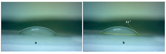 (a) Image of the water droplet and (b) contact angle measurement with Image J software.