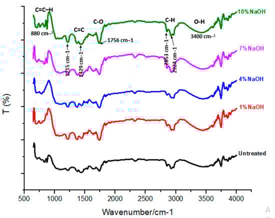 It can be observed that the spectra for both the untreated and treated rubber display peaks at 3400 cm−1, which reflect O–H stretching hydroxyl group vibrations. The O–H peak intensity of treated rubber is higher than the untreated rubber, which shows the presence of more O–H groups and intermolecular hydrogen bonding [28,44]. The O–H peak intensity gets higher for the 7% and 10% NaOH as it represents, the increased number of O–H groups caused by the extensive oxidation due stronger alkaline on the rubber.