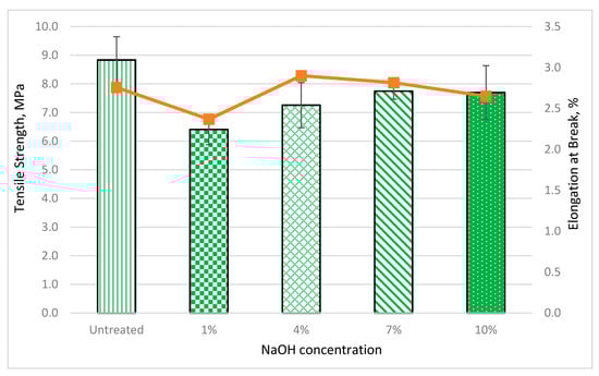 Tensile strength and elongation at break of the composites with different NaOH concentration.