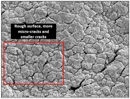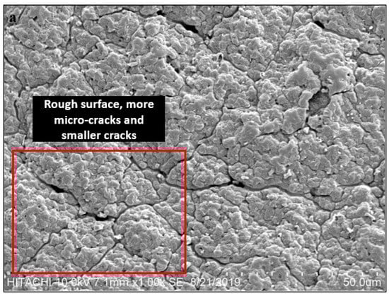Figure 7, Figure 8, Figure 9 and Figure 10 displayed the SEM rubber surface morphology, in which a significant effect of the different treatment concentration on the roughness of the rubber surface can be observed. Figure 7 and Figure 8 showed that the rubber surface with 7% and 10% NaOH treatment were rougher with many microcracks and the cracks are much smaller, these attributes lead to a larger rubber surface area. While Figure 9 and Figure 10 revealed that the rubber crumbs treated with lower NaOH concentration, 1% and 4% NaOH, respectively, which had a smoother surface with less micro-cracks and cracks are larger. A smooth surface inhibits the good coating of polyester on the rubber, and consequently the bonding is weaker, leading to lower tensile strength. A smoother surface typically has a higher contact angle with poor wettability properties; therefore, the polyester could not be well wetted on the rubber and did not have a sufficient physical bonding system to strengthen the adhesion. As a consequence, rubber and polyester will experience poor interfacial adhesion resulting in lower tensile strength.