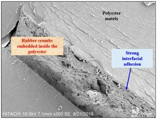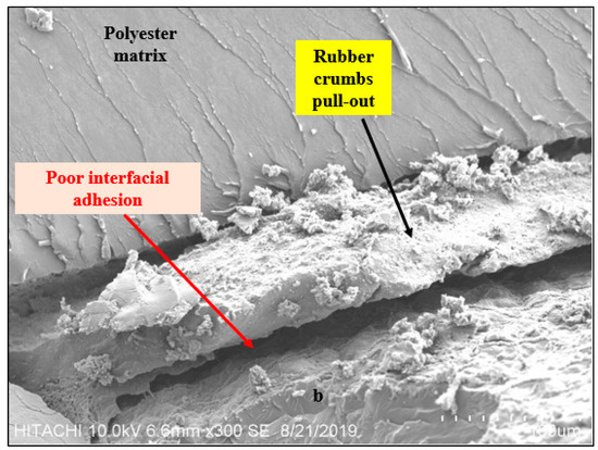 In the tensile fracture micrograph in Figure 11, stronger rubber–polyester adhesion for rubber that treated with 7% NaOH can be observed. The strong rubber–polyester adhesion provide composite with higher tensile strength. The SEM showed the rubber crumb was strongly embedded in the matrix even after fracture, and it is evident that the crumb was firmly adhered to the matrix. Figure 12 showed the rubber pull-out from the matrix, which demonstrated a poor interfacial adhesion between the rubber treated with 4% NaOH and the polyester matrix.