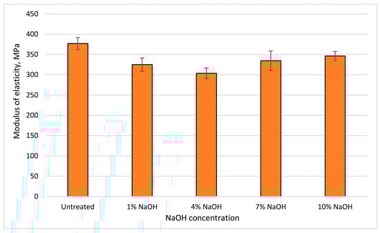 Apart from tensile strength, the modulus of elasticity of the composite also increased with an increased concentration of NaOH treatment, as shown in Figure 13. The improved bonding between the rubber matrix and the polyester matrix has a positive effect on their interfacial adhesion and prevents the failure of the composite from accelerating [23]. Furthermore, the ability of the rubber crumbs to adhere well in the composites enabled rubber to transfer the applied load evenly throughout the composites. It preventing from composite failure, thus providing the composite with better elastic modulus [41,50]. However, treatment with NaOH, to a certain extent, caused damaged to the rubber structure and elasticity, which decreases the composite modulus elasticity.