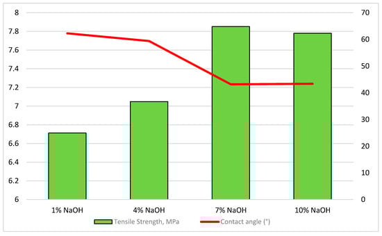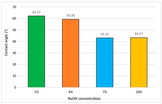 Surface roughness is also important in determining the surface wettability. The wettability of the surface increases as the contact angle decreases [11,23,39,41,49,56]. Rough surface substrate has smaller contact angle, meaning that the water droplet was thinner, indicating the surface is hydrophilic [17]. As discussed in the previous section, the rubber of 7% and 10% NaOH treatment has a rougher surface compared to 1% and 4% NaOH treated rubber (Figure 7 and Figure 8), which contributed to the lower contact angle measured in this work.