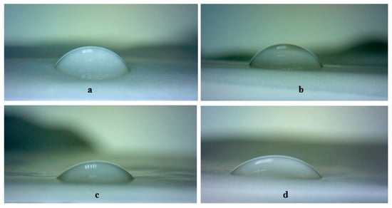 Water droplet profiles on NaOH treated rubber crumbs surface: (a) 1%, (b) 4%, (c) 7%, and (d) 10%.