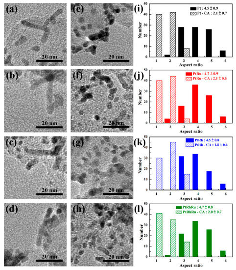 High-resolution transmission electron microscopy (HRTEM) micrographs of morphologies before CA: (a) Pt (b) PtRu, (c) PtRh and (d) PtRuRh; after CA: (e) Pt, (f) PtRu, (g) PtRh and (h) PtRuRh; aspect ratios distributions: (i) Pt, (j) PtRu, (k) PtRh and (l) PtRuRh.