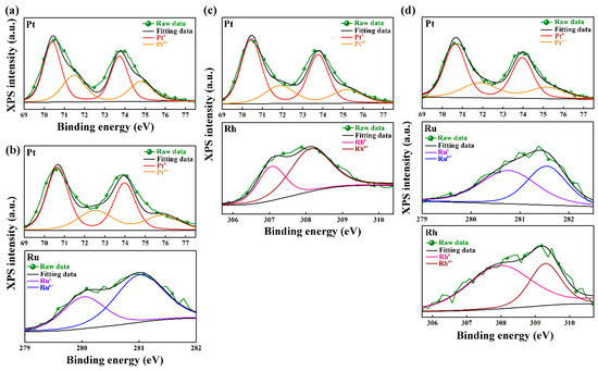 X-ray photoelectron spectroscopy (XPS) spectra of (a) Pt, (b) PtRu, (c) PtRh, and (d) PtRuRh.