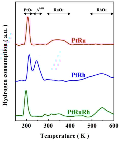 On the other side, the TPR experiments are carried out to analyze the topmost surface species of the catalysts. The TPR spectra of PtRu, PtRh, and PtRuRh are displayed in Figure 3. The main reduction peaks for the catalysts located between 200 and 230 K are assigned to the reduction of the surface platinum oxides (PtOx). For the reduction of ruthenium oxides (RuOx) and rhodium oxides (RhOx), the reduction peaks are located between 300 and 400 K [56,57] and above 500 K, respectively. The peak located at 250 K for PtRh may be owing to the reduction of surface PtRh alloy oxide (APtRh). Therefore, the main surface species of PtRuRh is Pt/Ru/Rh.