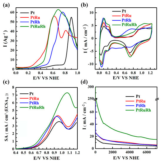 Moreover, in order to evaluate the stability of Pt, PtRu, PtRh, and PtRuRh catalysts, CA tests were carried out at 0.6 V in 0.5 M H2SO4 solution containing 1 M ethanol for 7200 s and the results are exhibited in Figure 4d, and the MAs at 0.6 V after 7200 s (I06-7200) are summarized in Table 1. As shown in Figure 4d, catalysts decay to different extents during CA tests owing to the poisoning of Pt surface active sites. Among them, PtRuRh shows the highest current density of 15.1 A/g(Pt) after EOR for 7200 s, due to the bi-functional mechanism by the surface Pt/Ru/Rh, where Pt provides active sites for ethanol adsorption and dissociation, and Ru/Rh provide OCS for oxidating and removing the adsorbed intermediates formed during ethanol oxidation [65,71].