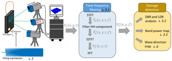 Apart from local defect resonance, other wave–defect interactions can be exploited for NDT using full wavefield measurements. For instance, the defect-related shift in local wavenumber is exploited in local wavenumber estimation methods [10,11,12,13]. Alternatively, the typical increase in vibrational amplitude at damage is exploited using the (weighted) root mean square energy calculation [14]. An increased sensitivity to damage is found when performing wavenumber filtering prior to the calculation of the energy maps [15,16]. In this way, both the shift in wavenumber as well as the shift in energy are exploited. These vibrometric methods show promising results for NDT but also have their limits in terms of minimal defect size and maximum defect depth [17,18].