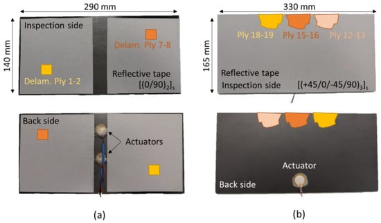 Carbon fiber-reinforced polymer (CFRP) components with defects. (a) Cross-ply [(0/90)2]s plate with artificial shallow (ply 1–ply 2) and backside (ply 7–8) delamination. (b) Quasi-isotropic [(+45/0/-45/90)3]s plate with side-delaminations at the top side.