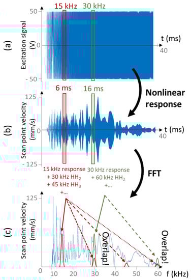 As explained in the previous section, a broadband excitation signal was used to make sure that potential LDRs were excited. The broadband nature of the excitation signal made higher harmonics extraction using the classical fast Fourier transform (FFT) impossible. This is graphically illustrated in Figure 3 for the CFRP plate with artificial delaminations. The component was excited using a burst chirp signal of duration 40 ms and frequency range 10 kHz to 60 kHz. For instance, at the time instance t = 6 ms, the instantaneous chirp excitation frequency was 15 kHz. This resulted in a linear response of the sample at flin = 15 kHz combined with the potential presence of nonlinear higher harmonic components: second harmonic at fHH2 = 30 kHz, third harmonic at fHH3 = 45 kHz, etc. (see Figure 3b,c, indicated in red). These higher harmonic components were of low amplitude and as such they were overshadowed by the linear part of the output response at 16 ms (i.e., flin = 30 kHz, indicated in green) and 28 ms (i.e., flin = 45 kHz) respectively. This is further indicated as ‘overlap’ on Figure 3c. Note again that reducing the frequency bandwidth of excitation was not an option as it would reduce the likelihood of exciting LDRs. As an alternative, a novel post-processing approach using short-time Fourier transform (STFT) and bandpass filtering in the time-frequency domain was proposed.