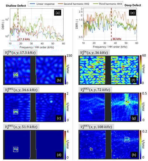 On the other hand, the DBR curves corresponding to the higher harmonic components do reveal an increased nonlinear activity at the defect at a multitude of frequencies. As an example, the vibration maps of the linear and higher harmonic components are shown for the frequency of 36 kHz. No sign of the delamination is visible in the linear response at 36 kHz (Figure 5f). However, an increased activity at the defect is seen in both the second and the third higher harmonic components (Figure 5g,h, respectively). The efficient generation of nonlinear components at the deep defect is related to LDR of the thin material section between the delamination and the backside [34].