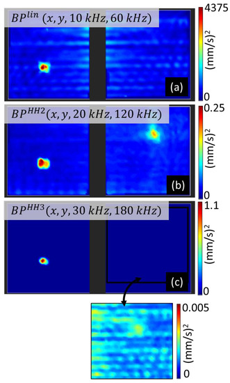 The band power map of the second harmonic component () reveals the presence of both delaminations (see Figure 6b). As such, this band power map can be used as a robust indicator for detection of both shallow and deep defects. The third harmonic band power map reveals the shallow delamination with very high contrast (see Figure 6c). However, for the deep defect, the third harmonic components are not efficiently transferred through the thickness of the component. This makes the backside-delamination hardly distinguishable from the damage-free material in the map. The exact origin of this absent HH3 is currently being investigated.