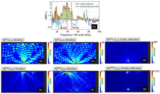 The DBR curve corresponding to the second harmonic component reveals an increased nonlinear activity at the defect. The maximum DBR is reached at 76 kHz (i.e., 2 × 38 kHz) and the corresponding amplitude map (Figure 7e) shows the nonlinear source behavior of the delaminated edge. While at 76 kHz the main nonlinear response is found at the middle of the top edge, other frequencies reveal other parts of the damage. As an additional example, the amplitude map of HH2 at 2 × 45 kHz = 90 kHz (Figure 7f) reveals the nonlinear behavior of the deeper side-delamination more towards the left of the top edge.