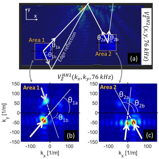 Detection of out-of-sight side-damage by using the second harmonic component measured at two small areas: (a) second harmonic amplitude map at 76 kHz with indication of the measurement areas, (b,c) wavenumber maps corresponding to the second harmonic component at 76 kHz with indication of the direction of the incoming wavefield.