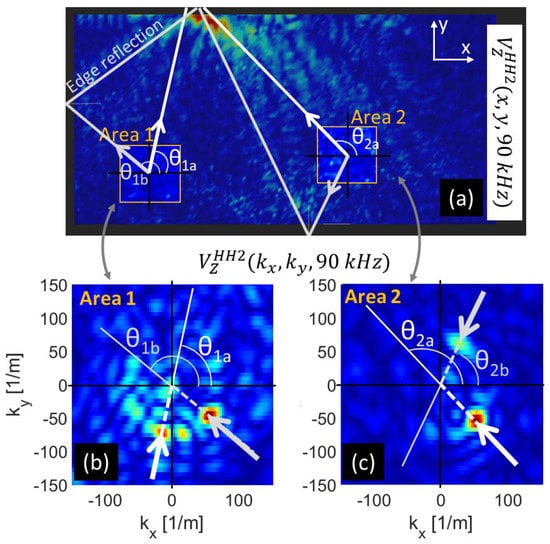 The wavenumber maps corresponding to the nonlinear HH2 response at f = 76 kHz, are shown in Figure 8b,c. Distinctive spots of high intensity are found in both wavenumber maps. These spots correspond to the second harmonic radiation induced by a nonlinear source (defect). The direction of the source can be found as: . In Figure 8, arrows are drawn in these directions. The arrows correctly point towards the source of the higher harmonic components, namely the side-delaminations at the top side of the component. Note that for one of the observed directions in Figure 8b, the wavefield originates at the side-delamination but is reflected at the bottom edge. The edge is perceived as a virtual nonlinear source, and as such can be employed to further improve the localization of the actual defect. Hence, the out-of-sight damage can be detected and even localized without the need for a baseline measurement.