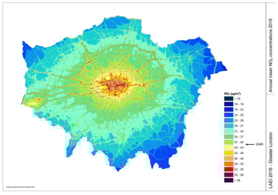 NO2 levels exceeding regulatory limit values distributed over London, England (London Atmospheric Emission Inventory 2016, © Crown 2020 copyright Defra and BEIS, licensed under the Open Government Licence (OGL)).