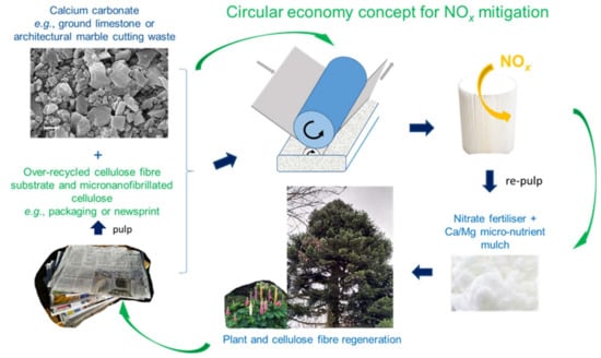 The two facets of this introductory exposé, i.e., the need to engender a circular economy approach by finding a further use for otherwise denatured recycled natural cellulose fibres and the foreseeable omnipresent need to mitigate NOx gaseous pollution, form the motivation to seek a technological advance to encompass these aims into a working hypothesis from which an effective NOx sorbing filter can be developed. Sustainability is not served by creating further waste, regardless of the effectiveness of the technology employed for NOx capture. In light of this further constraint and the wish to both follow BAT and provide the necessary BREFs for eventual permit issuance, the choice of sorbent and filter material support is critical. Minerals of various types are known to adsorb oxides of nitrogen. The very principle of surface area measurement of fine materials using the Brunauer-Teller-Emmett (BET) method [] relies on the inert surface adsorption of gas as a function of applied partial pressure, first as a monomolecular surface layer and, later, as gas pressure increases, as a multilayer condensate that reveals the presence of surface micropores and mesopores. Therefore, the choice of any material having sufficient surface area and sorption potential to adsorb oxides of nitrogen under ambient atmospheric conditions would suffice. However, to prevent desorption under subsequent changes in environmental conditions, and to enhance the total capacity of the process for NOx storage beyond that of surface saturation alone, it is beneficial to have a material that promotes a material surface conversion reaction rather than pure adsorption, which enables the ultimate complete transformation of the host sorbent into a stable nitrogen species such as a nitrate salt. In addition, if the nitrate salt itself can contribute to a further sought-after product, then it not only supplies a solution for mitigation but also valorises a pollutant gas by generating an onward use, which results in significant contribution to the circular economy.