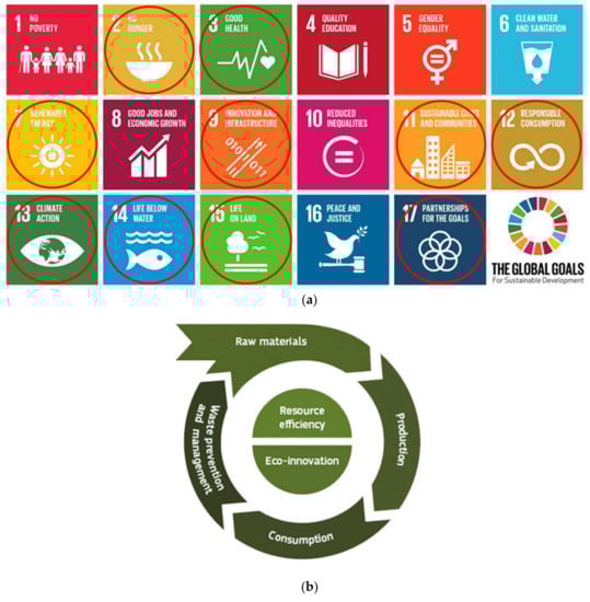 (a) The United Nations (UN) sustainability development goals. The circled goals were achieved in this project and (b) EU (European Union) Commission criteria for circular economy.