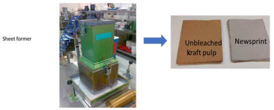 Hand sheets were formed (Figure 5) at a weight of approximately 80 g·m−2 using a laboratory hand sheet former. Starting solids content in the former was 0.24 w/w%, and drainage was made from 663 g of pulp suspension. After wet forming, the hand sheets were wet pressed and left to dry for 24 h in a conditioned room (relative humidity (RH) 50% at 23 °C) [,,]. The sheets were constrained in drying frames to prevent shrinkage by clamping the position in contact with in-frame mounted cotton sheets. Brightness was not important for this application. Therefore, both the brown unbleached Kraft and the grey newsprint provided the necessary substrate support for subsequent application of the NOx reactive coating.