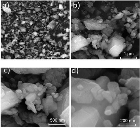 In this study, GCC was made from Norwegian marble, which was wet ground and chemical-free (Omya Hustadmarmor AS, Molde, Norway). Field emission scanning electron microscope (FESEM) images (JEM-2200FS; JEOL Ltd., Akashima, Tokyo, Japan) of the fine ground material are shown in Figure 6.