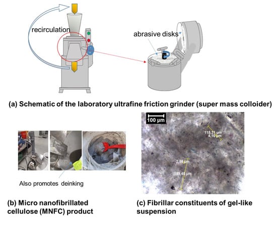 (a) Super mass collider grinding fibres between two abrasive contacting disks, (b) water separated from the fibrillar mass during production. Note its colour containing a high proportion of suspended ink particles. (c) The gel-like colloidal mass of micro nano-fibrillated cellulose (MNFC) produced and shown as fine fibrils clustered in the electron microscope image. Dimensions (length and breadth) of the largest retained fibrils are also illustrated by the added yellow lines to increase visibility—black spots indicate retained ink particles (mostly carbon black).