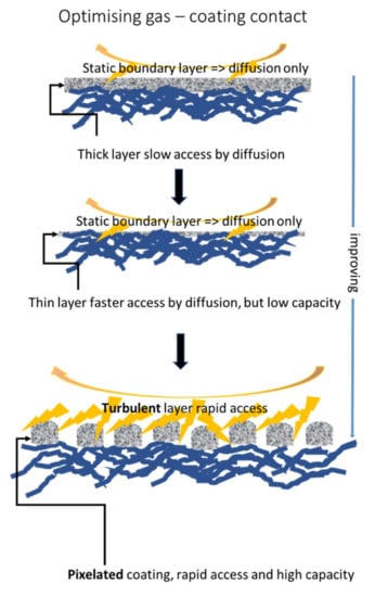 The most convenient method to present a greater interactive surface is shown schematically since the pixelated coating in Figure 9 consists of a spatial distribution of coating agglomerates over the surface of the permeable substrate. Such a configuration aids both through-flow and surface flow modes by generating turbulence at the solid-gas interface, which destroys the static boundary layer. The destruction of the static layer provides ready access for the gas to the surface of the agglomerates, which, due to their largely flocculated particle-particle structure, are themselves highly permeable and have open and highly connected pores for pressure-driven ingress and easy diffusion of gas.