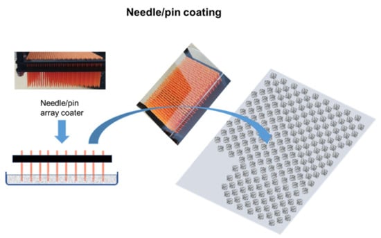 One possible method to achieve pixelated coating is to use pin/needle coating. A hand-operated apparatus is shown in Figure 10. In this case, the pins were constructed from the polymer. Therefore, a surface treatment of the pins by surfactant was employed. Upscaling would require reel-to-reel methods for efficiency, and printing could be used instead of metered coating technology, e.g., a large cell ceramic Anilox cylinder in flexography, to achieve a pixel structure.