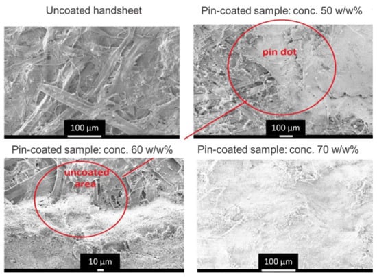 The scanning electron microscope (SEM) images of the surface of pin coated substrate showing applications made at medium and high solids content (50 w/w%, 60 w/w%, and 70 w/w%, respectively)—different magnifications are used conveniently to demonstrate both the coating dot edge line and individual coating structure.