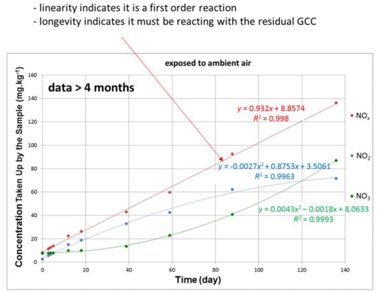 The initial finding that CaCO3 underwent the reaction shown in Equation (1) was based on a first observation where ground limestone was left exposed to ambient air in a product store from which material was regularly collected for further processing using motorised vehicular access. Figure 12 reveals the results from which important conclusions can be drawn. Namely, (i) the balance between nitrite (NO2−) and nitrate (NO3−) production favours nitrate over time, (ii) the NOx uptake, defined by nitrogen content as the sum of the nitrogen contained in the analysed nitrite and nitrate concentrations, was linear over an extended duration (months), and (iii) the continued uptake could not be based on surface saturation by inert adsorption, but rather by continuous reaction via conversion of -CO32− to -(NO2−/NO3−)2. Given the linearity in Figure 12, estimations of the rate of uptake were made when examining the results from the laboratory surface’s flow filter design without having to extract samples repeatedly.