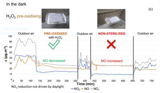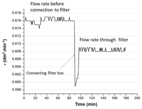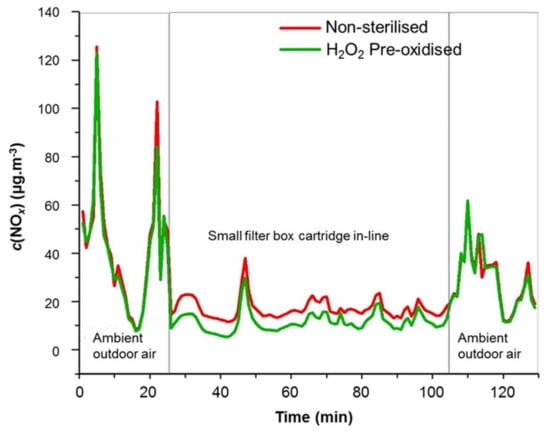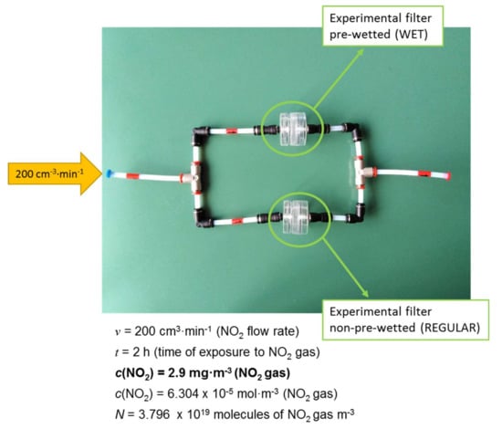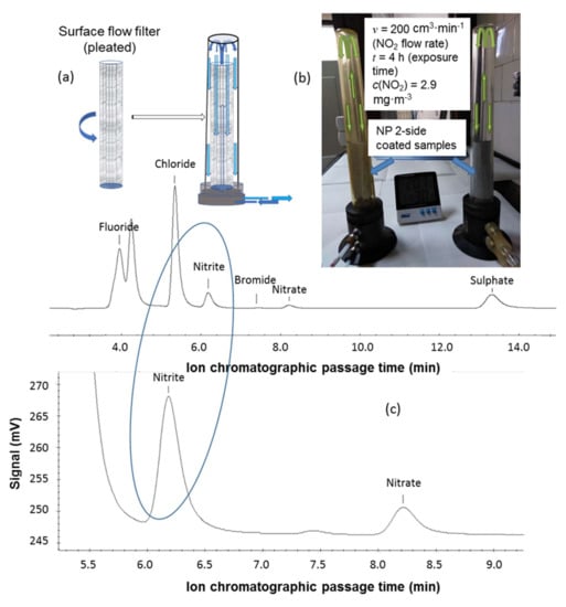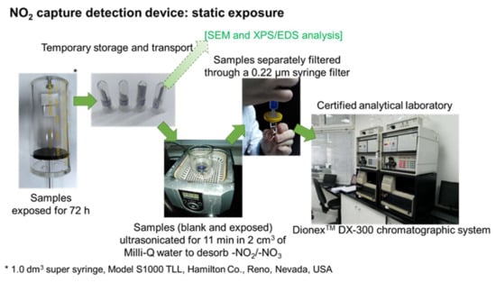 Initially, some pre-tests were conducted using small samples of smooth coated substrate (coatings made by hand draw-down, as described previously) absorbing NO2 under static exposure conditions. Samples were cut from the larger filter element and placed in a 1-dm3 super syringe (Model S1000 TLL, Hamilton Co., Reno, NV, USA). The syringe plunger was inserted, and ambient air was expelled. Then, the syringe was joined to a synthetic NO2 pressurised bottle source, and the syringe plunger retracted to fill the body with NO2. In this way, the small coated samples were maintained for a given time and exposed statically to the NO2 gas at a concentration level of 10 ppm (18.8 mg·m−3). The test procedure is illustrated in Figure 13. After exposure, the samples were removed and stored in sterile sealed tubes, which were sent for microscopic analysis and either X-ray photoelectron spectroscopic (XPS) analysis or energy dispersive X-ray spectroscopy (EDS). Others were treated to extract soluble –NO2− and –NO3− salts into Milli-Q deionised water.