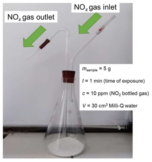 A powder method was initially used to confirm the reaction shown in Equation (1) and in Figure 12. Powder, which was stored under ambient moisture conditions, was loaded into a chromatographic column with an inlet and outlet used to introduce and expel NO2 gas at an adjustable low flow rate. After given intervals of exposure time, a sample of the powder was recovered for liquid extraction to measure the nitrate and nitrite contents via ion chromatography.