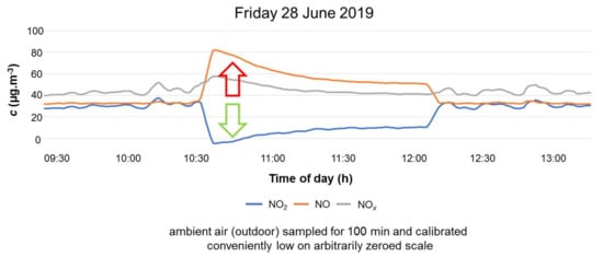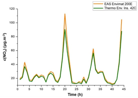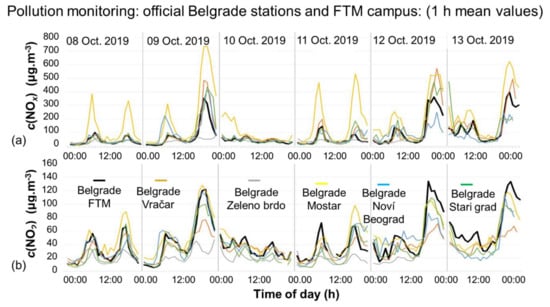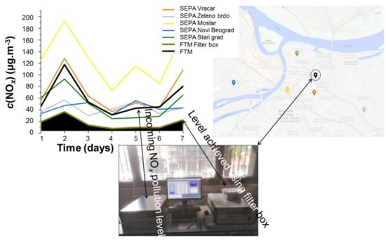 Evidence of reaching air quality better than the lowest measured in the low traffic density suburbs of Belgrade, Serbia. NOx concentration recordings in ambient air for five sampling points in the city of Belgrade in relation to the FTM sampling points (1 d mean values from 13 to 19 October 2019) [,].