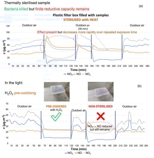 The samples had already reacted partly to produce nitrate simply by pre-exposure to ambient air (Table 6). This was expected, but it indicated that, when designing such filters, a simple surface adsorption does not suffice, as a stored filter under ambient conditions would eventually have its surface completely saturated by absorbed gas, whereas the shelf life of a reactive material is far longer since the material itself becomes gradually consumed. In addition, the reaction could be damped unless the reaction product(s) are removed. Given the sealed nature of this experiment, reaction products were not removed during exposure.