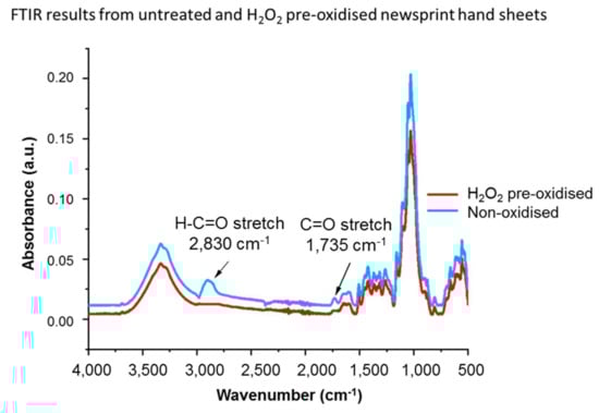 Equation (1), which shows the reaction of NOx with CaCO3, indicates that moisture (H2O) is an intrinsic part of the mechanism. This occurs because the reaction is an ionic bond exchange of CO32− for nitrite/nitrate 2(NO2−/2NO3−), and anionic group exchange between the salts requires they dissociate in aqueous medium. A supply of moisture within the immediate molecular environment is needed to support the CaCO3-NOx interaction. To guarantee the presence of moisture, it must be absorbed from the surrounding air. Materials that absorb moisture in this way are termed hygroscopic, and if they also dissolved in the absorbed moisture, then they are termed deliquescent. This need can be met by a humectant material that absorbs and stores moisture in excess of its own matrix dispersion. Such a material is conveniently sourced from the same feed material used as the substrate (cellulose fibres) [] and produced in the form of micro nano-fibrillated cellulose (MNFC), which is readily derived either by high shear homogenising under high pressure extrusion or by micro-grinding, as shown in Figure 7, from either virgin or multi-recycled fibres []. Using over-recycled fibre, which is intrinsically weak, enables less energy input to be consumed to form the fine fibrillar material needed. To reduce energy consumption further, sodium sulphite (Na2SO3)2 was added, following the report of Ämmälä et al. [], which effectively reduced the number of passes through the laboratory mass collider from 10 to 7. In addition, the bleaching effect of sulphite facilitated further de-inking of the newsprint fibres. To aid removal of excess sulphite and reduce the number of ink particles, the product was repeatedly washed with water.