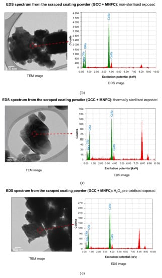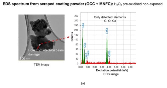 The MNFC fibrils have surfaces, which expose many OH groups. The binding functionality of cellulose nanofibrils, such as those present in the MNFC described here, is considered to be due to these plentiful primary and secondary hydroxyls on the fibrillar surface. These OH groups, as reported by Tayeb et al. [], are able to attract each other electrostatically via hydrogen bonds, which cause the particles to build ordered structures. These groups not only promote hydrogen bonding but can be used as sites to modify surface chemistry via ready grafting. The strength of hydrogen bonding is high, so MNFC can be used to add strength to the substrate to compensate for weakness of the multi-recycled fibre structure. However, this was not done in the current work. The intended use was to act as a binder to bind the coating CaCO3 particles together and bind the coating to the substrate. The OH bonding potential is ideally compatible with the cellulose fibre substrate, which also bonds via OH groups.
