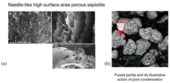SEM images of (a) sepiolite, and (b) fused perlite with a schematic insert that demonstrates the pore condensation of gas.