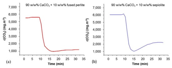 Examples of CO2 capture in fused perlite and sepiolite when mixed at 10 w/w% with GCC are shown in Figure 29a,b, respectively.