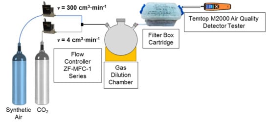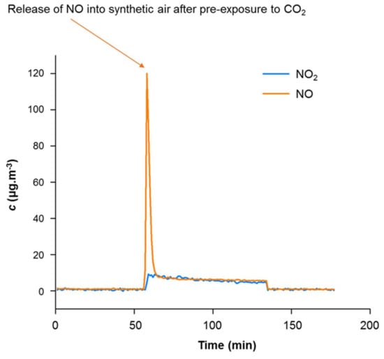Given the two different mechanisms between the CO2 capturing materials proposed, sepiolite is expected to act selectively due to the chemical reaction required, whereas perlite adsorbs purely physically. These differences will manifest depending on the gas species under exposure. For example, sepiolite intercalates NO []. In this context, the preference of sepiolite for NO means that any NO initially intercalated in the mineral becomes exchanged for CO2. The apparatus set-up used to run sequential exposure to CO2 and subsequent flushing with synthetic air is shown in Figure 30.