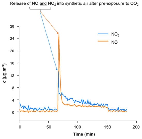 In contrast, fused perlite is non-selective, and, when using a filter that comprised 90:10 by weight GCC: fused perlite pre-exposed to NOx-containing ambient air, subsequent exposure to CO2 expelled both NO2 and NO, which were previously absorbed into the pore structure (Figure 32).