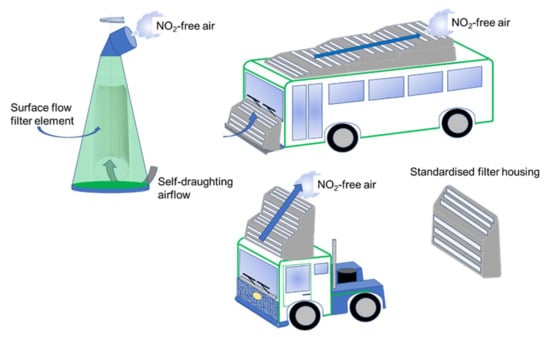 Convincing authorities of the practicality of the developed surface flow filter concept will be a challenge. If strong commitment and cooperation of city and transport authorities can be achieved, a universally standardised filter mounted on the exterior of municipal and public transport vehicles could be deployed, such that, as one vehicle emits pollutant, the vehicle following it acts to mitigate the impact. Eventually, the concept could be extended to the commercial truck fleet and replace the current aerodynamic up-flow wind drag reduction deflectors to provide a cleaner environment on motorways. Such a design would avoid any need for roadside installations, hugely reduce investment, and obviate the need for external energy-consuming forced draughting. This use on municipal and transport vehicles could easily be launched before expanding the concept to private car owners. The cartridges are low cost, and exchange centres could be established for collective and envisaged conversion to the fertiliser. Both concepts for street-side and vehicle-mounted filters are shown schematically in Figure 35. A further distinct advantage of the principle of surface flow rather than through-flow is that gaseous pollution is frequently accompanied by heavy particulate environmental load that a surface flow filter does not block under such circumstances. There may be particulate deposition onto the filter exchange surface, and there might be progressive, slow lowering of efficiency. However, gaseous diffusion cannot be prevented, and the filter will continue to function, whereas a through-flow filter would rapidly stop functioning.