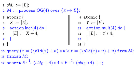 Figure 1 shows the required program annotations. First, x is connected to by initialising a new model M on line 2 that executes according to . The actions and are then linked to the corresponding sub-programs on lines 5–7 and 11–13 by identifying action blocks in the code, using special program annotations. We use these annotations to verify in a thread-modular way that the left thread performs the action (on lines 5–7) and that the right thread performs (lines 11–13). As a result, when the program reaches the annotation on line 15, only the process is left on the process level—the part has already been executed alongside the program. Since the Owicki–Gries postcondition is already proven externally, by other means, in the previous step, the program logic may rely on its validity. But since we tracked the contents at heap location on the process level as the variable x, one may indirectly conclude that the heap at location has evolved as described by . In other words, using program annotations we prove that the program is a refinement of , meaning that we get the asserted property in the logic, on line 17.
