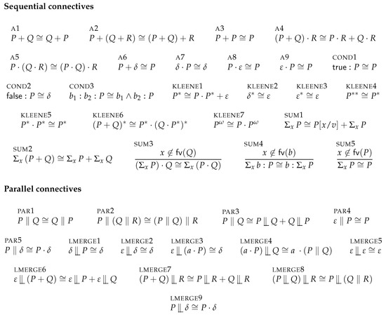 - Fokkink, W.; Zantema, H. Basic Process Algebra with Iteration: Completeness of its Equational Axioms. Comput. J. 1994, 37, 259–267. [Google Scholar] [CrossRef][Green Version]