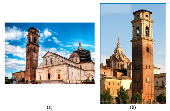 The bell tower was initially built in the second half of the 15th century between 1468 and 1470 [11,12]. Recently restored, the tower is inserted, today, in the Diocesan Museum of the Sabaudian city (see Figure 1). The masonry tower was erected completely by the will of bishop Giovanni di Compey (Figure 1a). Between 1720 and 1722, the court architect Filippo Juvarra worked on the crowning and the dome, the tower assumed its current appearance—a brick construction that ends with a baroque bell tower made by stone decorations [11,12] (see Figure 1b and Figure 2).