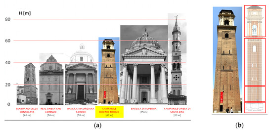 Tall masonry building in Turin and parts constituting the bell tower. (a) The bell tower is the third tallest masonry building in the city (63 m); (b) The tower is subdivided into different parts—the stem and the bell cell are constituted by different materials and were erected in different times and by different building techniques.