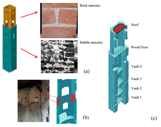 The FEM: (a) The bell tower is made with different materials and different building techniques (sack masonry). (b) Chains have also been inserted within the model in correspondence with the "key heads" observable from the outside. The loads of the various elements were assessed by multiplying their thickness by the specific weight of the materials. The different dead loads were associated to the different levels and structural elements. (c) Axonometric cross-section of the tower.