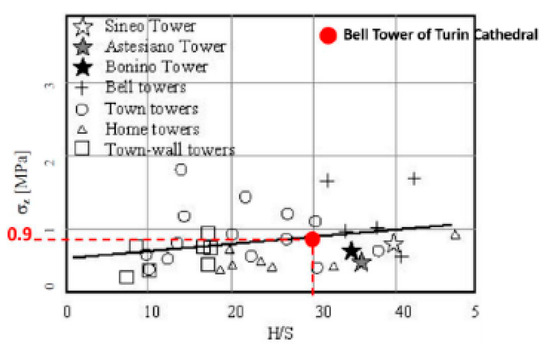 Compressive stress σ for different ancient tall masonry towers in Italy [22]. The maximum stress is reported as a function of the ratio between the height and the maximum depth of the bearing wall of the structure.
