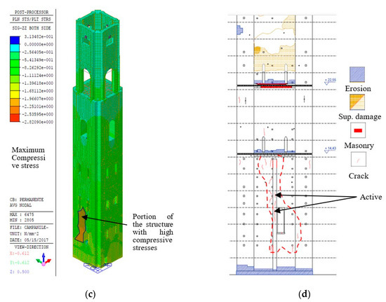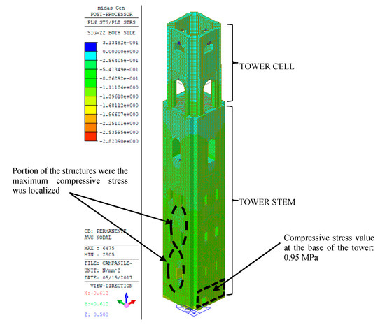As far as the horizontal actions are concerned, the values of the seismic action and the pressure exerted by the wind on the tower were evaluated and implanted in the model. The weights of the various elements were assessed by multiplying their thickness by the specific weight of the materials, and in the case of the masonry vaults, taking into account a thickness equal to 30 cm and the specific weight equal to 18 kN/m3, a dead load of 5.0 daN in assumed. For the timber floor a thickness equal to 12 cm and a specific weight equal to 5.75 kN/mc is considered (Figure 3c,d). The vaults were considered susceptible to crowding, and therefore, an accidental load of 5 kN/m2 is assumed. As for the roof and the facades, snow, wind, and seismic loads were considered according to the Italian rules for the evaluation of these kind of actions. Figure 4 shows a detail of the area where the highest vertical tension values were found; the value at the base of the tower stress value obtained is about 0.95 MPa. In addition, the calculation of the compression stress at the base of the tower can be carried out with a rough approximation: σ = N/A= 66526/63.15 = 1.05 MPa. The stress value at the base of the tower obtained from the FEM model was compared with the results obtained [5,6,7,8,9,10] for different masonry towers and tall buildings. In particular, the values obtained for the tower are similar to that showed in the trend of vertical tensions as the reported heights of the towers [9].