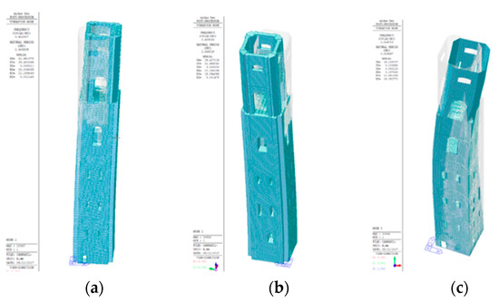 Representation of the modal analysis: (a,b) The two modes of the tower in the y and the x directions, represented by flexural modalities, (c) The third mode showing a torsional modality.
