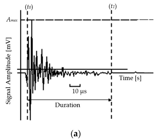Each channel consists of an analog-to-digital converter (ADC) module with a sampling rate of 10 mega-samples per second, which is adequate to measure frequency components up to 1 MHz, covering satisfactorily the typical frequency range of broadband PZT transducers. However, in the present application, the use of highly sensitive resonant transducers (with resonant frequency of 63 kHz) appeared more appropriate. During AE monitoring, the typical frequencies of signals emitted from micro-cracks and sources, generated in materials such as concrete and masonry, range between 50 kHz and 250 kHz. The sampling rate of the AE device (10 Ms/s) is between 200 and 50 times the AE signal frequency correlated to the damage evolution. In Figure 7, a typical AE signal is reported. The AE equipment used in the present paper allowed us to set the appropriate threshold value due to the monitored structure and the environmental conditions. As regards the amplitudes, the instrumentation used permitted the determination of two different modalities in the definition of the threshold values, beyond which the signal is effectively recognized and recorded (see Fig. 7a). The signal threshold value is normally defined in a range from 50 µV to 100 mV. The great variability on the thresholds that can be set by the AEMission device allowed for the definition of the most appropriate one for each sensor set, based on the condition in which the monitoring is operating [6,7,8,9,10,20]. The background noise, in fact, can be generated in different sources and external conditions. The causes of the noises can be mechanical, electromagnetic, or generated by human action or environmental conditions. Generally, there is a tendency to maintain a low threshold level in order to avoid in the cutting of a large amount of significant data. In this way, it will be possible to subsequently filter the data during the post-processing phase. On the other hand, the preset thresholds for the acquisition must be high enough to avoid saturation of the acquisition memories due to the effect of repetitive signals and due to the background noise. The threshold methods used in the various cases were implemented in the software of the device used and reported by the authors in recent publications [20].